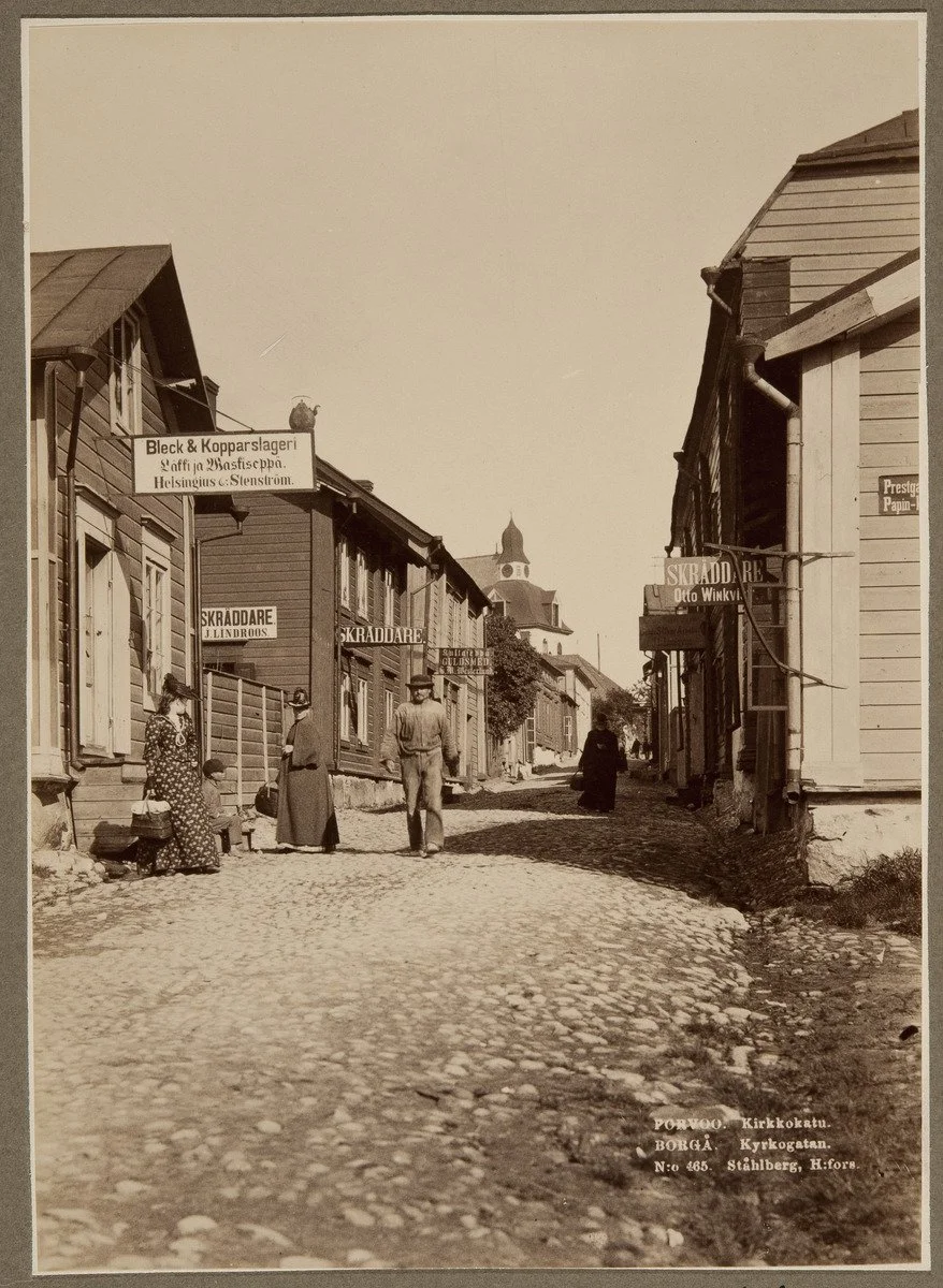 Photo: A street scene on Kirkkokatu in Porvoo, 1890s. The image shows cobblestone streets and wooden houses, with signs for various businesses, including tailors and metalworkers. People are seen walking and interacting on the street, providing a glimpse into daily life in the town.