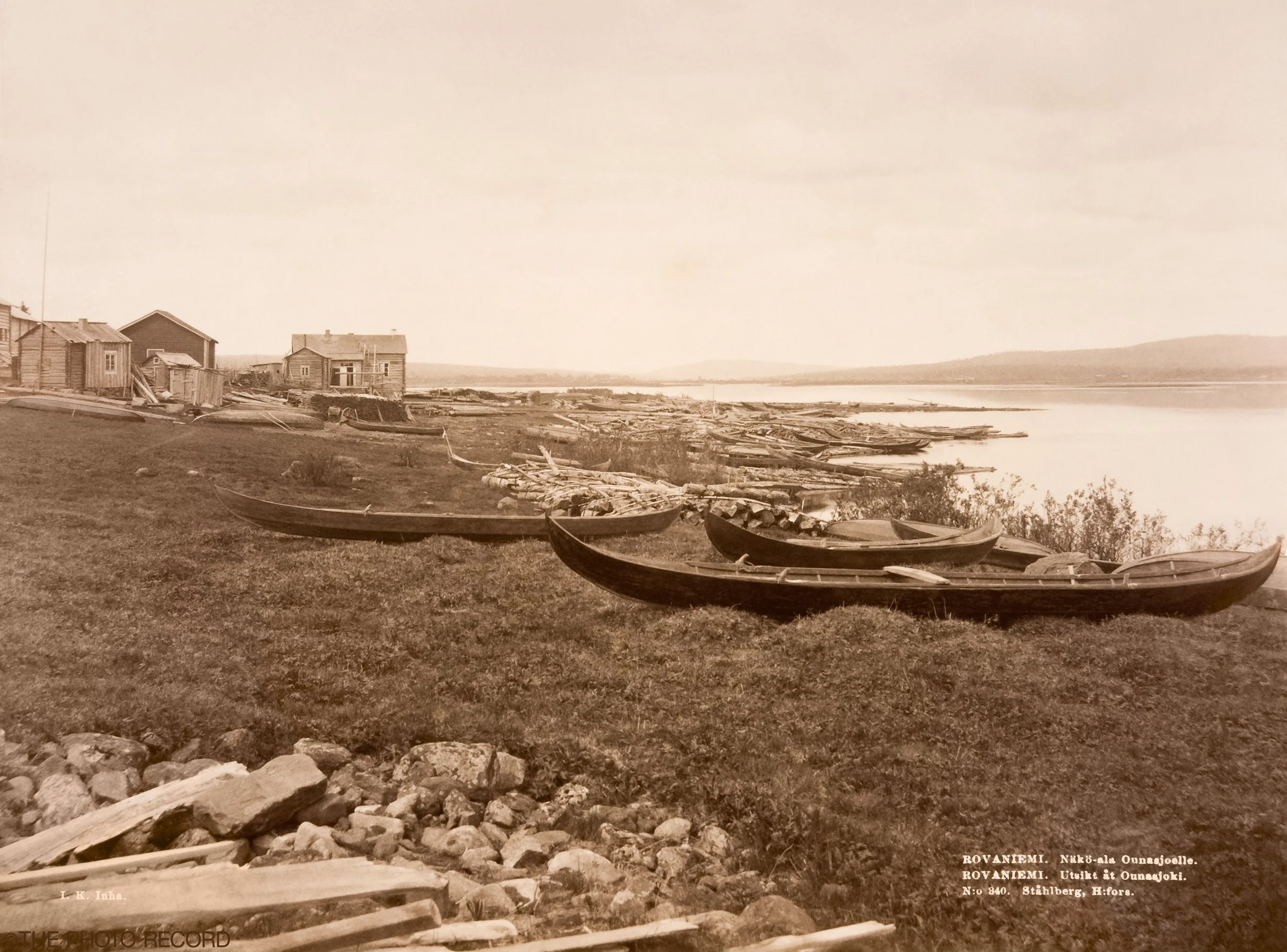 Photo: A quiet scene along the Ounasjoki in the late 1800s, with boats along the shore, humble wooden buildings standing tall in the sparse landscape, and distant fells completing the picturesque backdrop.