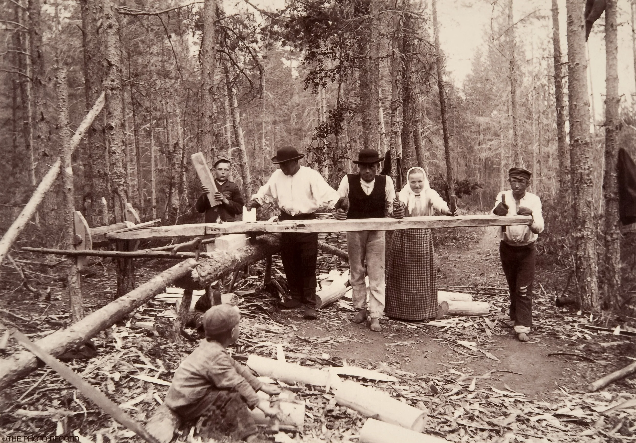 The image shows the planer in action. A group of people push the rod, causing it to strip a shingle from the log. A man catches the shingle and throws it into a nearby pile. Meanwhile, the boy gathers the shingles and stacks them neatly, creating an organized pile visible in the background. A little boy prepares the logs by cleaning them with a small hatchet, ensuring they are ready for the planer.